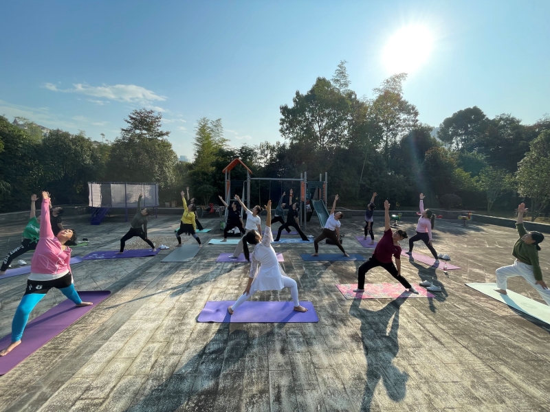 清晨,伴随着悠扬的瑜伽音乐,户外瑜伽教学开始了。在付芳老师的引导下,居民朋友们认真地调气、冥想,在呼吸新鲜空气的同时感受天人合一的意境,周围环绕的鸟叫声、蝉声都使人格外放松。