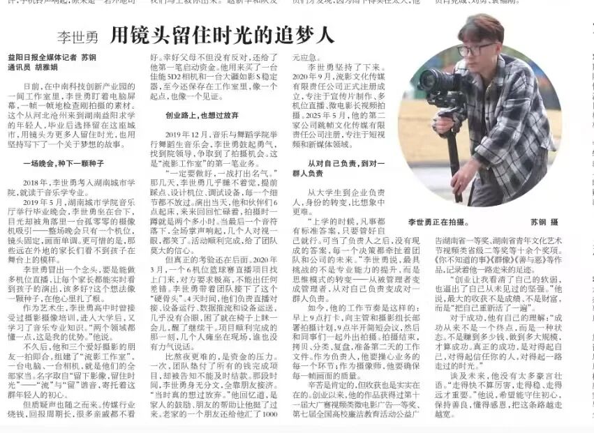 日前,在中南科技创新产业园的一间工作室里,李世勇盯着电脑屏幕,一帧一帧地检查刚拍摄的素材。这个从河北沧州来到湖南益阳求学的年轻人,毕业后选择留在这座城市,用镜头为更多人留住时光,也用坚持写下了一个关于梦想的故事。